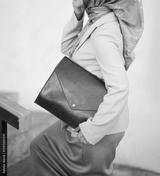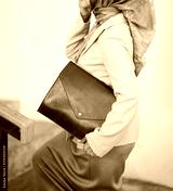 A woman's body wearing a hijab and formal attire with a brown leather laptop bag walks up the concrete stairs.