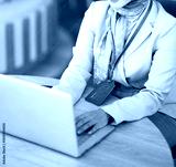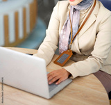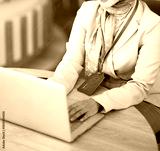 A woman's body in formal attire is working with a laptop on a wooden table.