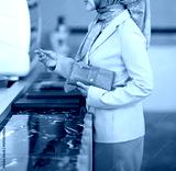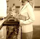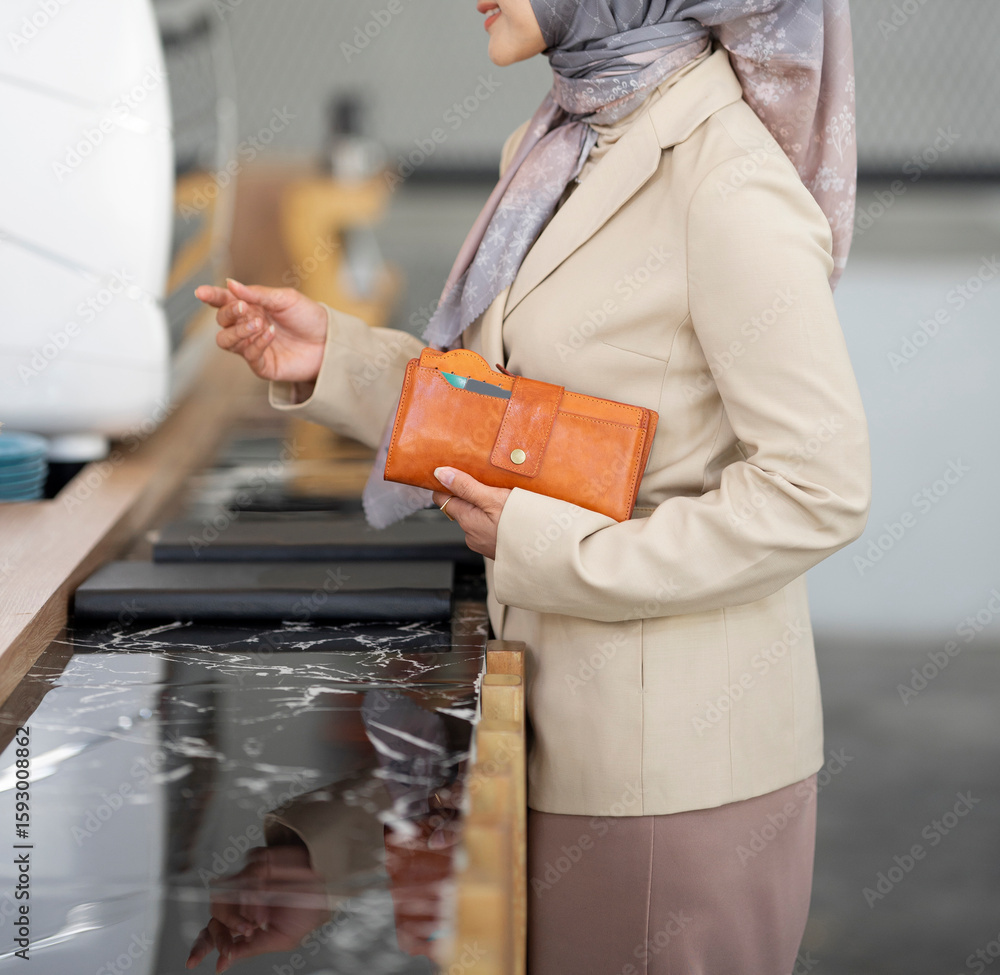 A woman's body wearing a hijab and formal attire stands in front of the reception desk holding a brown leather purse.