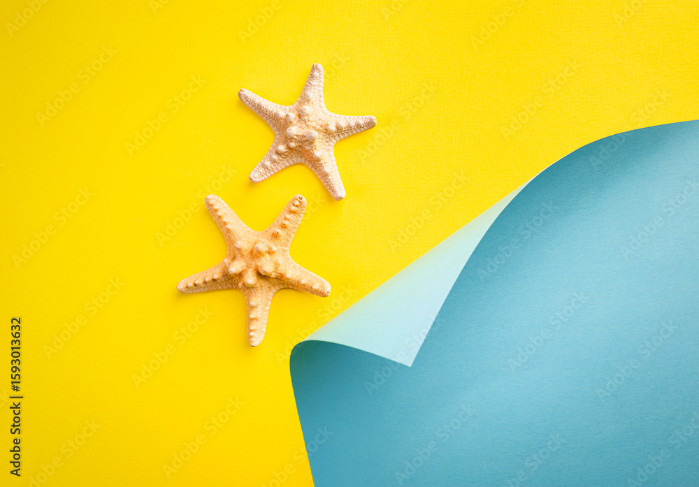 composition of exotic sea shells and starfish on blue and yellow background, top view. Summer sea flat lay
