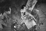 Young female artist painting abstract picture in studio, beautiful sexy woman portrait