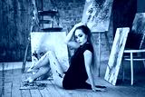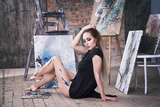 Young female artist painting abstract picture in studio, beautiful sexy woman portrait