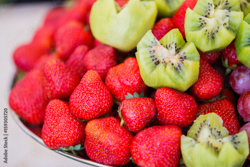 Fresh fruits on plate. Strawberries, kiwi, grapes on catering banquet table. Selective focus