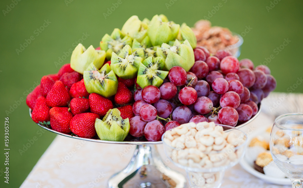 Fresh fruits on plate. Strawberries, kiwi, grapes on catering banquet table. Selective focus