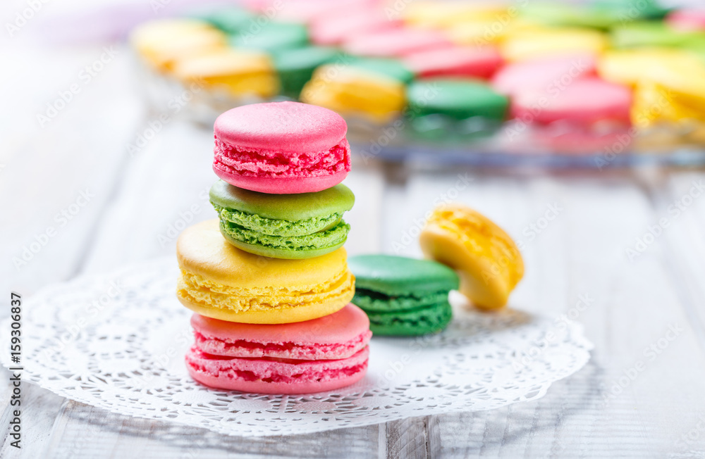 Colorful tasty macaroons on napkin, natural light selective focus. Sweet and colorful dessert close up