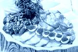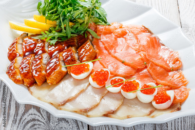 Seafood platter with salmon slice, smoke sturgeon, quail eggs with red caviar, slices fish fillet, decorated with arugula and lemon on wooden background close up. Mediterranean appetizers. Top view