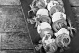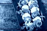 Caprese salad with Mozzarella cheese, tomatoes, pesto sauce and basil herb leaves on black slate stone chalkboard on wooden background close up. Mediterranean healthy food. Top view