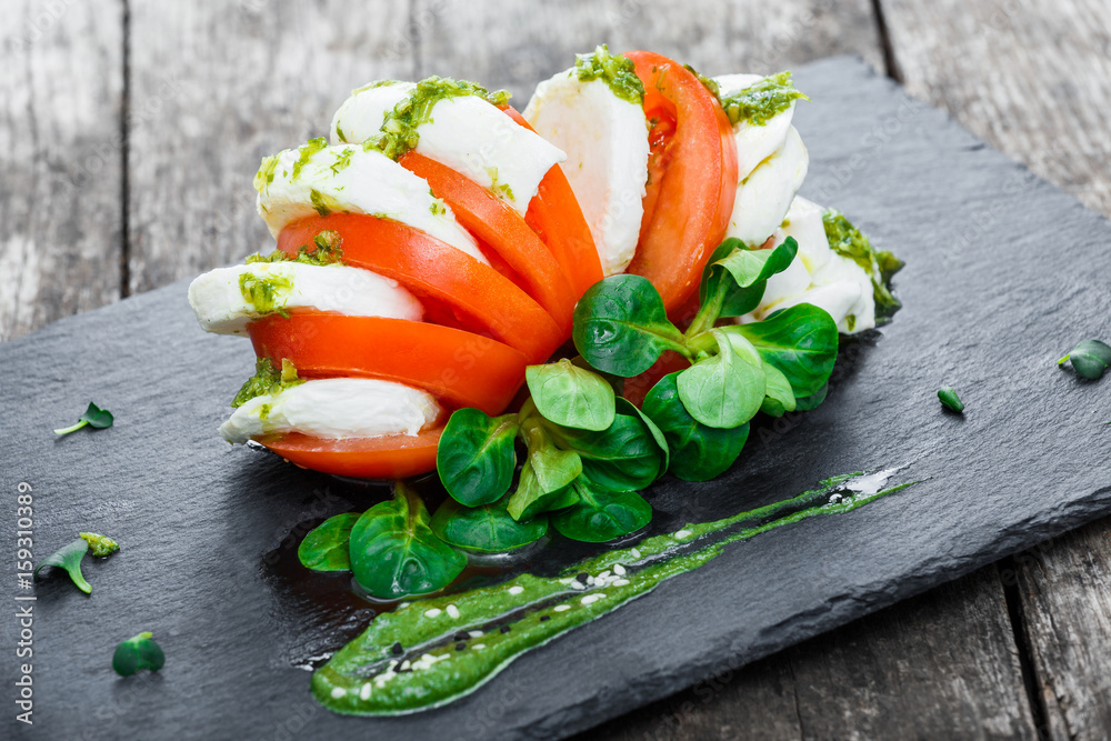 Caprese salad with Mozzarella cheese, tomatoes, pesto sauce and