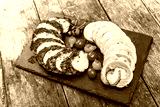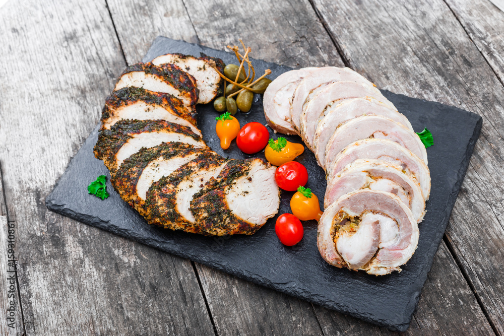 Slices of Homemade meatloaf, veal and pork tenderloin stuffed with vegetables on black slate stone chalkboard on wooden background close up. Meat appetizer. Top view