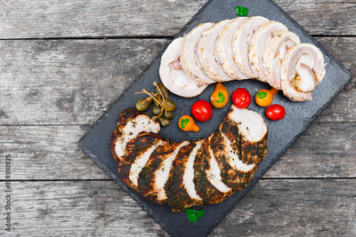 Slices of Homemade meatloaf, veal and pork tenderloin stuffed with vegetables on black slate stone chalkboard on wooden background close up. Meat appetizer. Top view