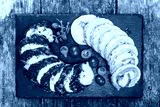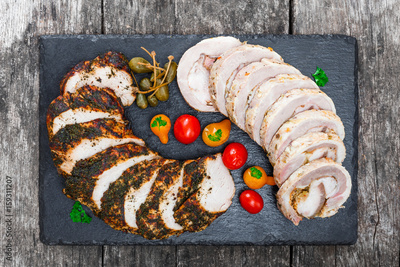 Slices of Homemade meatloaf, veal and pork tenderloin stuffed with vegetables on black slate stone chalkboard on wooden background close up. Meat appetizer. Top view