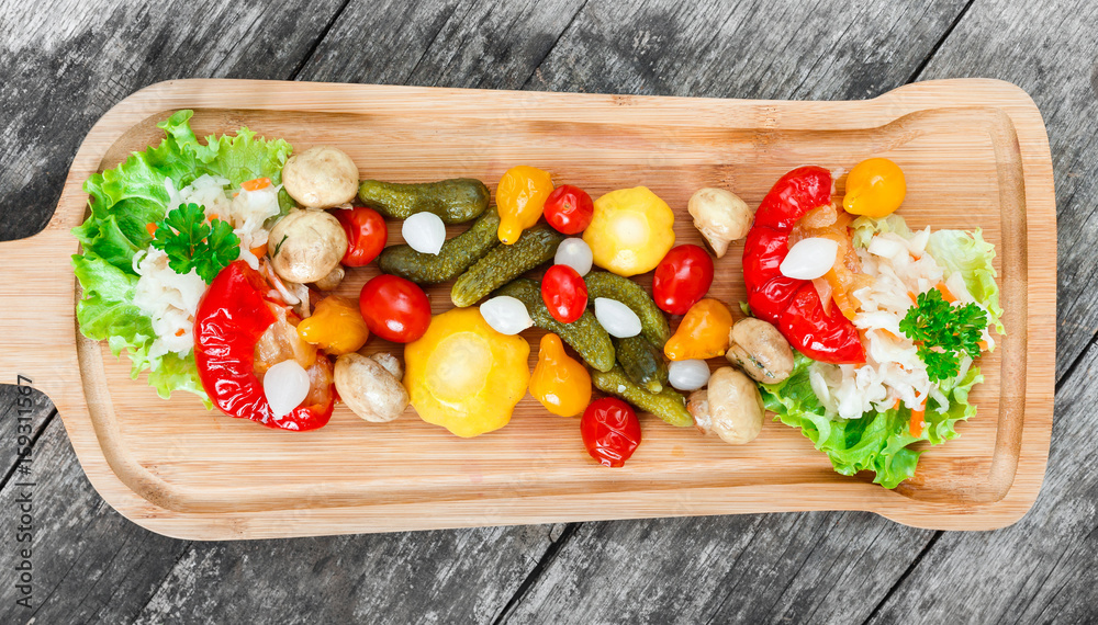 Assorted pickled vegetables - Sauerkraut cabbage, peppers, cucumbers, tomatoes, onions, mushrooms and herbs on cutting board on wooden background close up. Snacks and Wine appetizers set. Top view