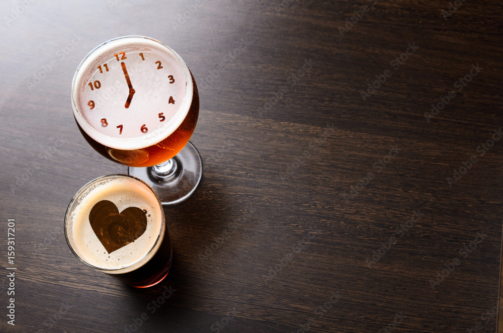 Heart and clock silhouettes in two glasses of fresh beer on pub table, view from above