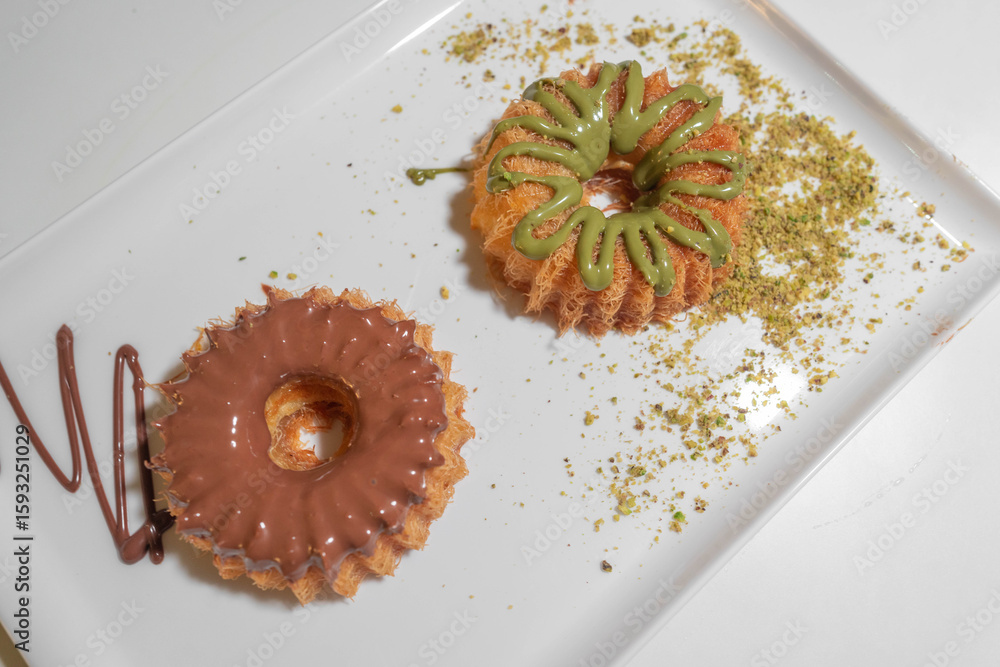 Yummy sweets made of cream cakes with a variety of flavors - Chocolate cream and nut round dessert - Middle Eastern dessert with a modern twist
