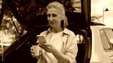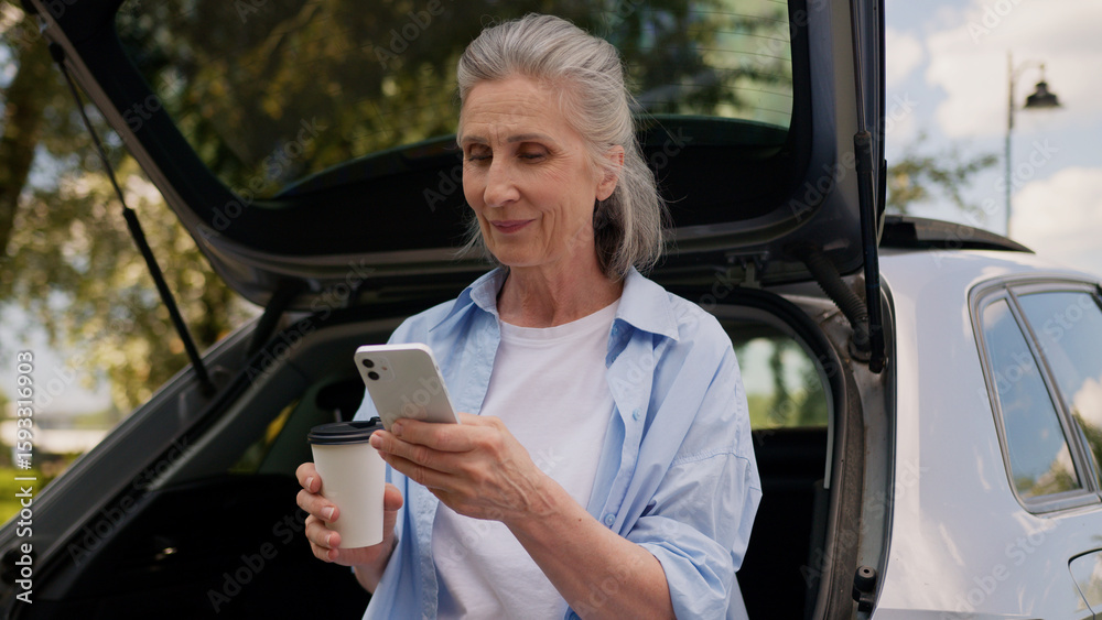 Carefree relaxed Caucasian aged lady elderly woman female senior mature car auto driver traveler lean automobile trunk using mobile phone cellphone chatting drink coffee enjoying break weekend outdoor