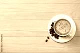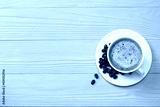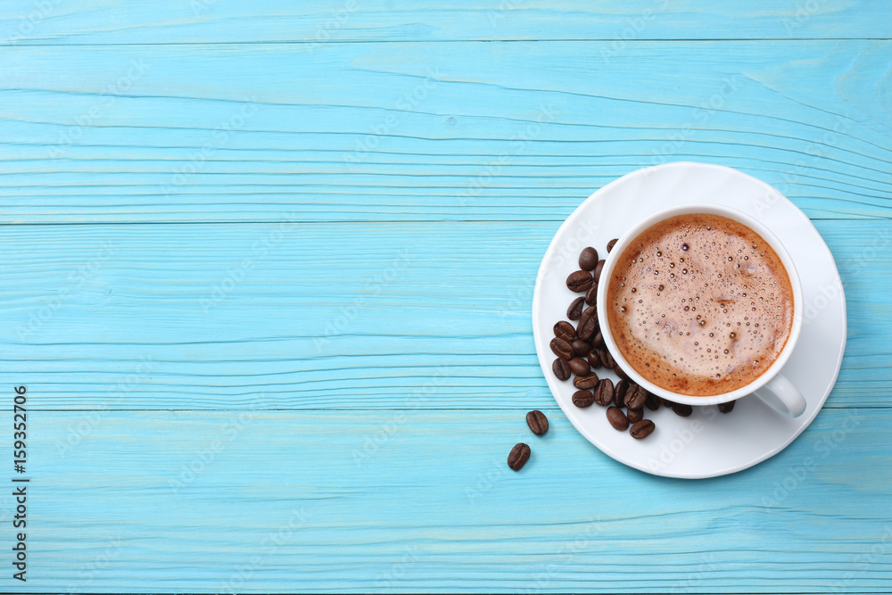 coffee cup with coffee beans on blue wooden background. top view with copy space