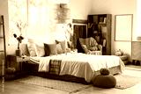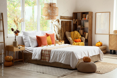 Interior of cozy bedroom with bed, armchair, pillows and pumpkins