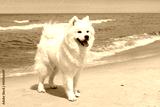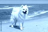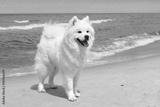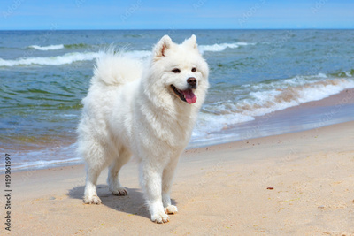 White dog Samoyed stands near the sea on a Sunny day