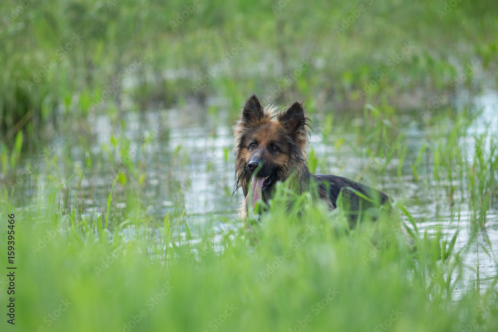 German shepherd dog in lake water