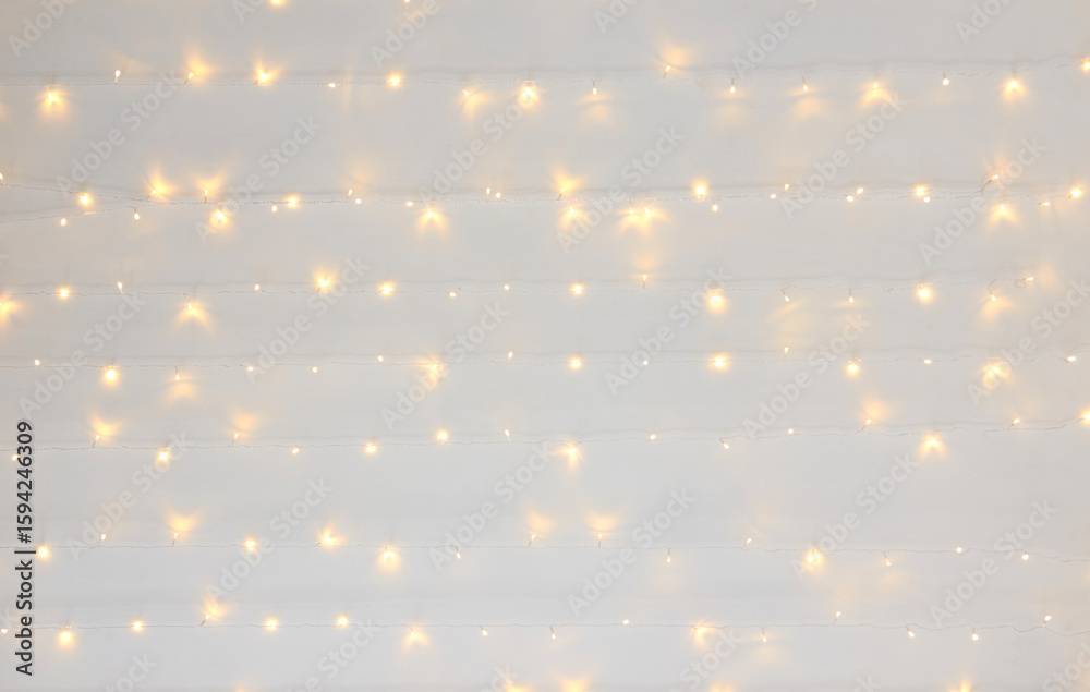 Soft warm white string lights on neutral background creating cozy atmosphere.