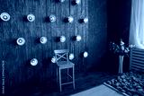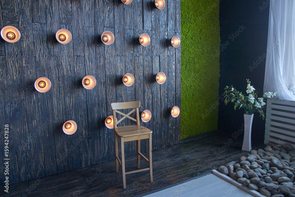 Modern interior design with wooden chair and unique lighting in cozy living space.