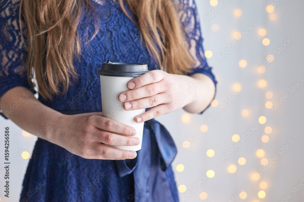 Caucasian female in blue lace dress holding coffee cup with sparkling light background.