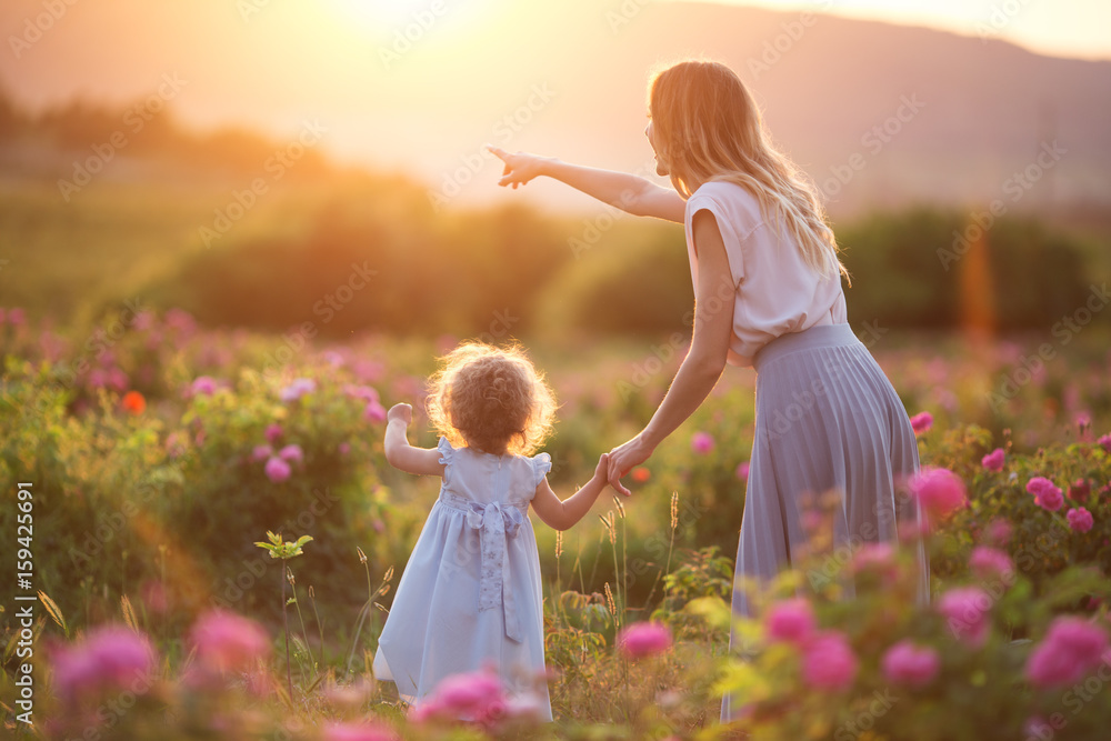 Beautiful child girl with young mother are wearing casual clothes walking in roses garden over sunset lights