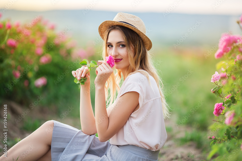 Beautiful young girl is wearing straw hat and casual clothes sitting in a garden with pink blossom roses