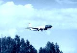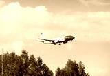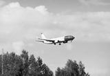 A white and red flying plane against a blue sky background on a clear sunny day. Transport planes rockets helicopters.