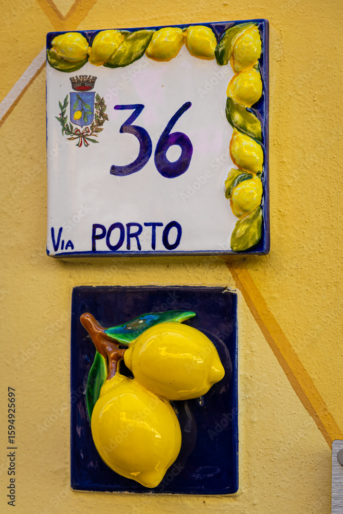 Yellow lemons on cobbled street in Lemonero sul Garda, Italy, with rustic architecture and summer vibe