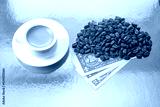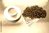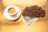 a white ceramic cup filled with rich Turkish coffee, surrounded by roasted coffee beans and U.S. one-dollar bills on a golden surface, symbolizing the value and luxury of coffee.