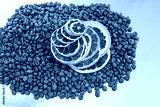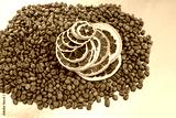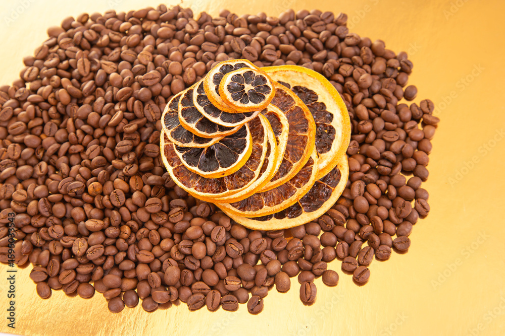 Rustic arrangement of coffee beans and dried orange slices on a golden background, perfect for culinary art photography. coffee aroma and taste citrus descriptors
