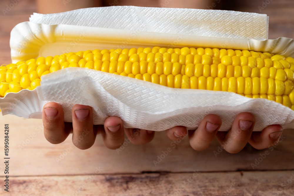 Cooked corn on a paper plate