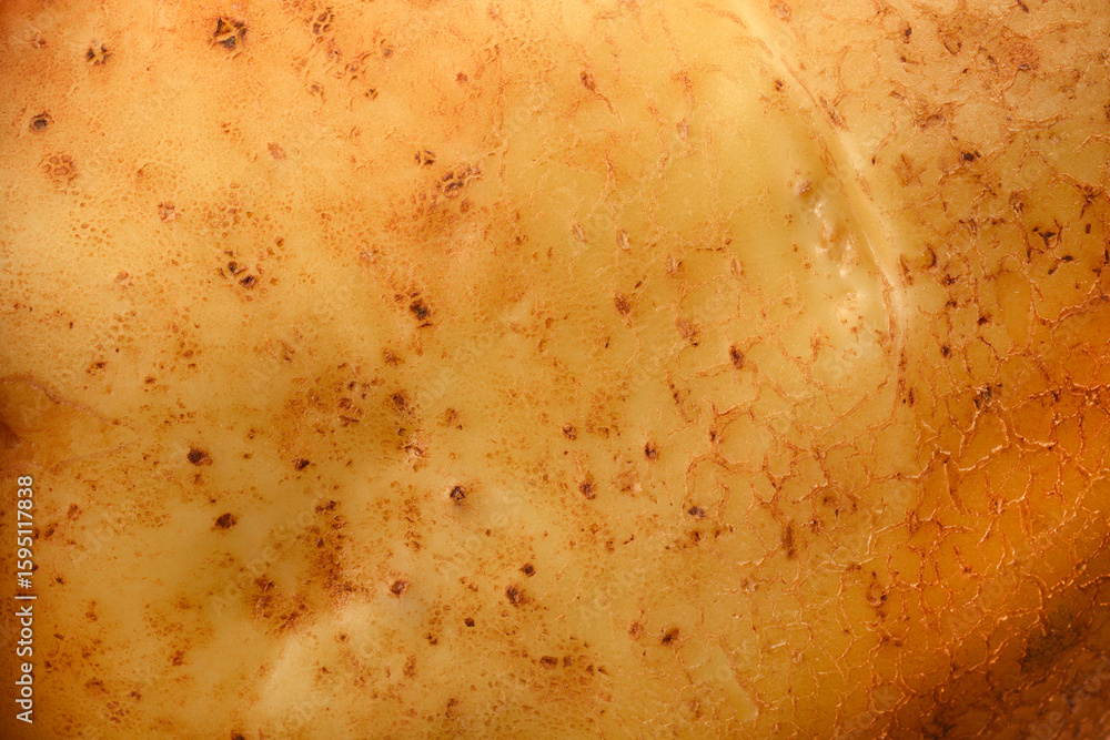 A detailed close-up reveals the rustic, textured skin of a potato, showing its natural imperfections and patterns