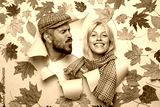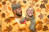 Funny couple are getting ready for autumn sale. Couple advertise your autumn product and services. Bearded man and blond woman in yellow paper background with leaves.