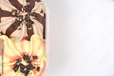 A top-down view shows swirled hazelnut and vanilla ice cream flavors, topped with dark and white chocolate shavings, with ample copy space above for text