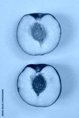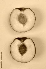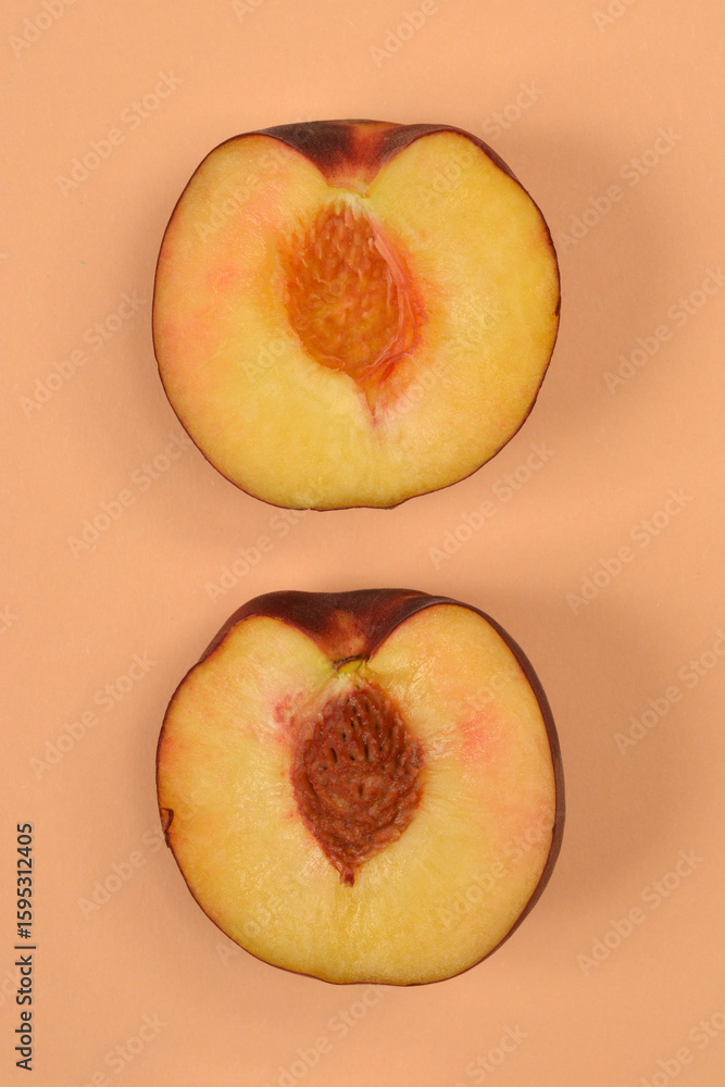 Two halves of a ripe peach, showcasing their yellow flesh and contrasting pits, are arranged vertically on a soft, peachy background