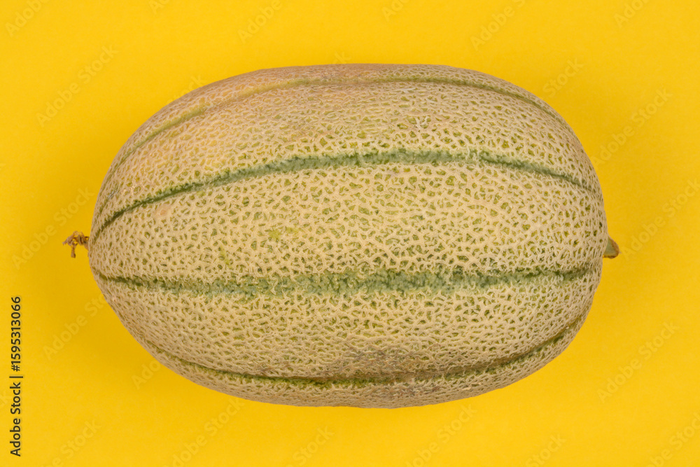 A single, ripe cantaloupe melon with its distinct netting and green stripes is centered on a vibrant yellow background