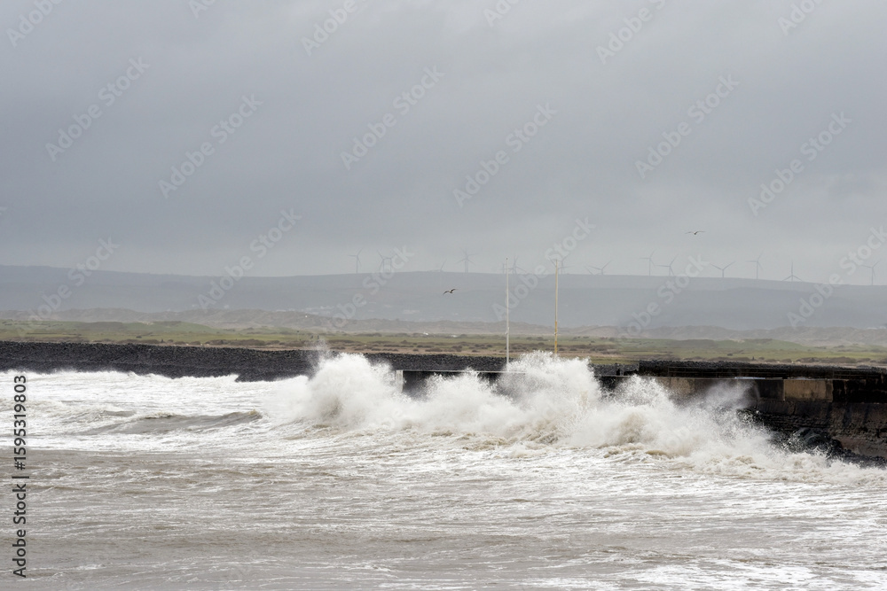 Powerful waves crash against the sea wall with wind turbines for energy production on the horizon