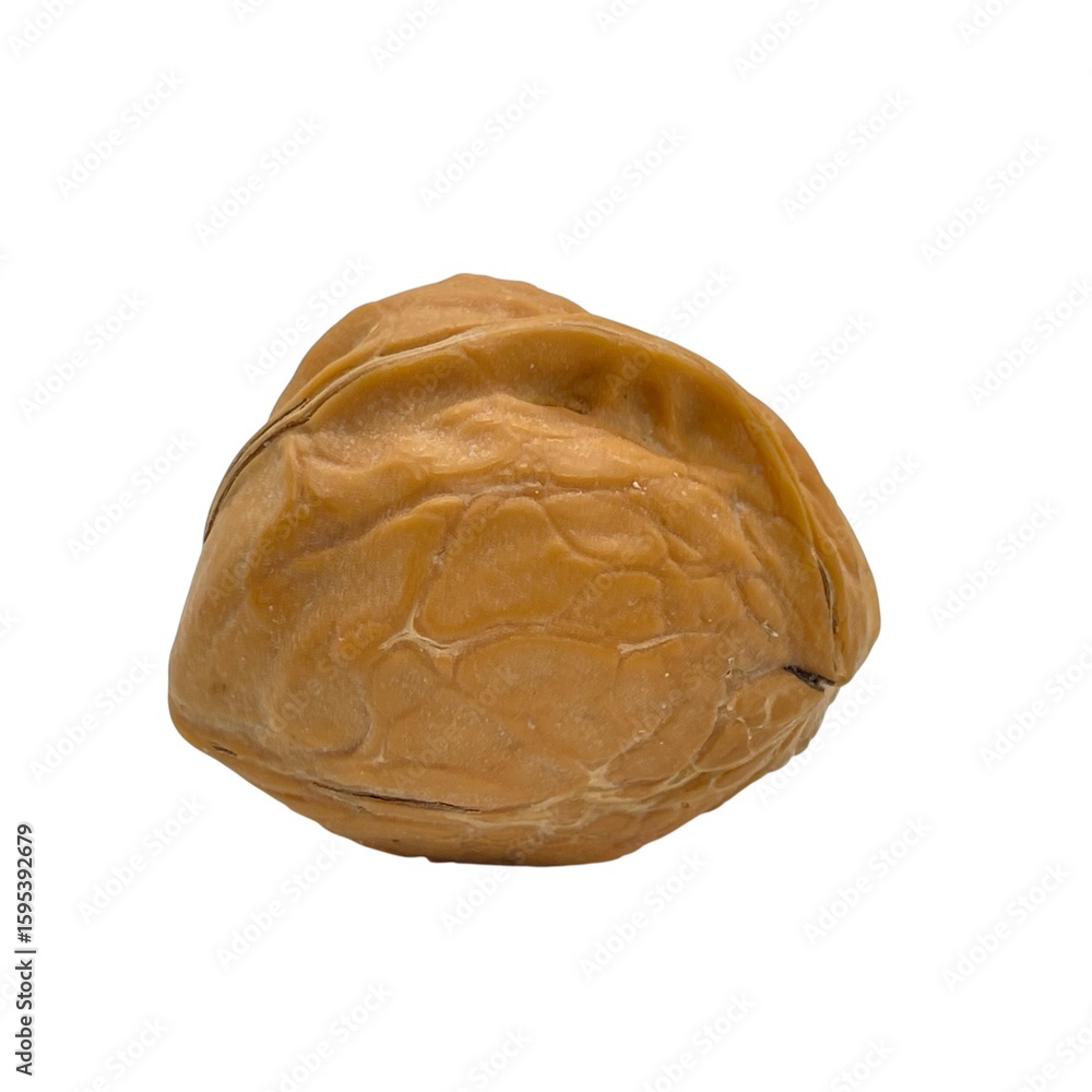 A whole walnut in its hard, wrinkled brown shell, uncracked and isolated on a white background