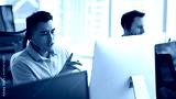 Focused Asian call center or helpline employee looks at PC monitor screen, leads clients interaction, provide solutions, sales support or information, using corporate software for customer management