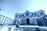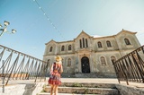 A young woman ascends stone steps towards the Holy Monastery of Agios Gerasimos in Cephalonia. The light catches the aged walls as she explores the Greek isle
