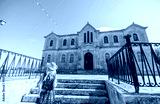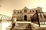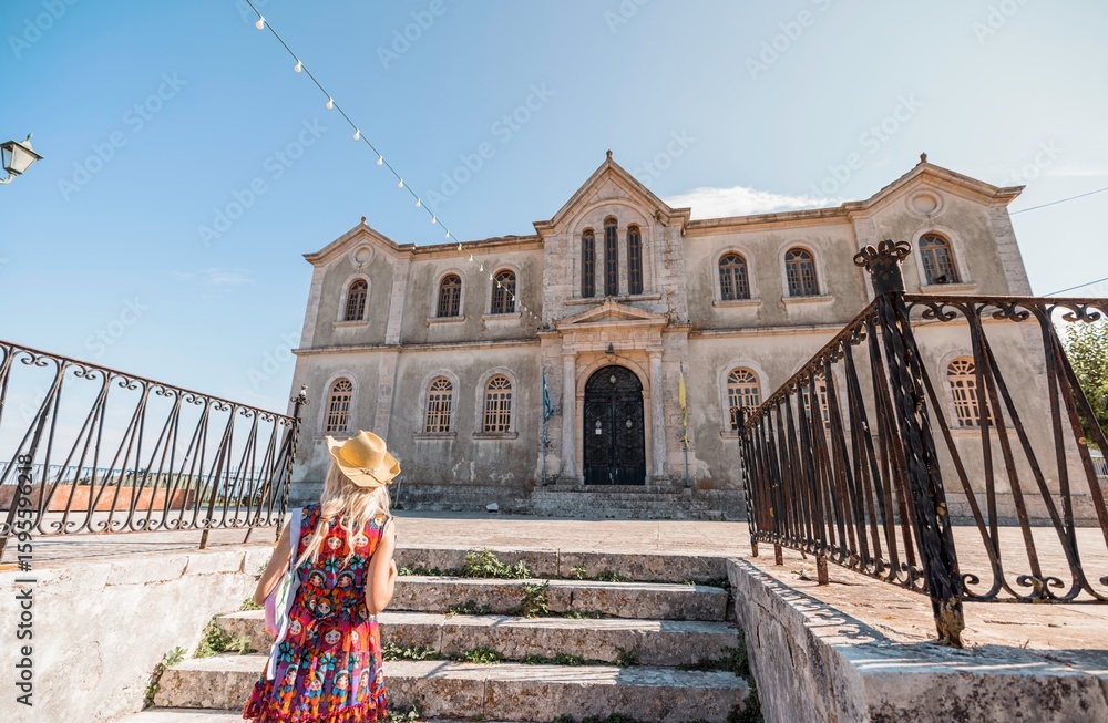 A woman with blond hair, wearing a colorful dress and straw hat, climbs stone steps towards the Monastery of Saint Gerasimos on a bright, sunny day in Kefalonia, Greece