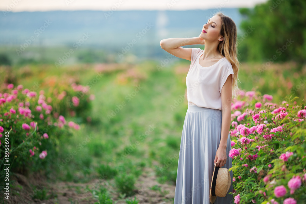 Beautiful young girl is wearing casual clothes sitting in a garden with pink blossom roses
