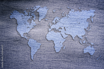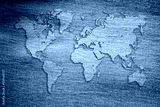 World map on jeans background. Travel concept banner, flyer or poster