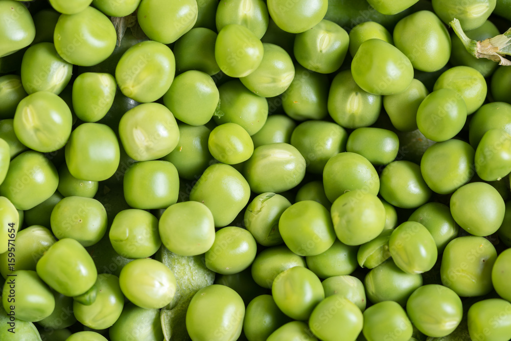 Flat lay pile of fresh green peas closeup macro