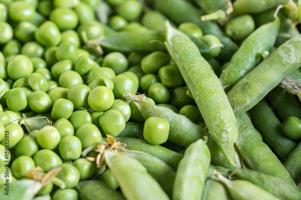 Closeup macro pile of fresh green peas ready for cleaning
