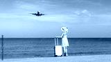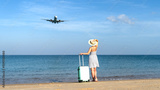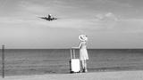 A woman with a suitcase for traveling on the beach will meet a passenger plane