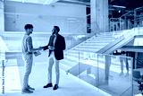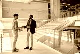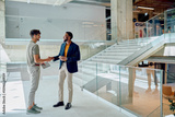 Two businessmen shaking hands in a modern office building lobby, celebrating a successful meeting and solidifying their partnership