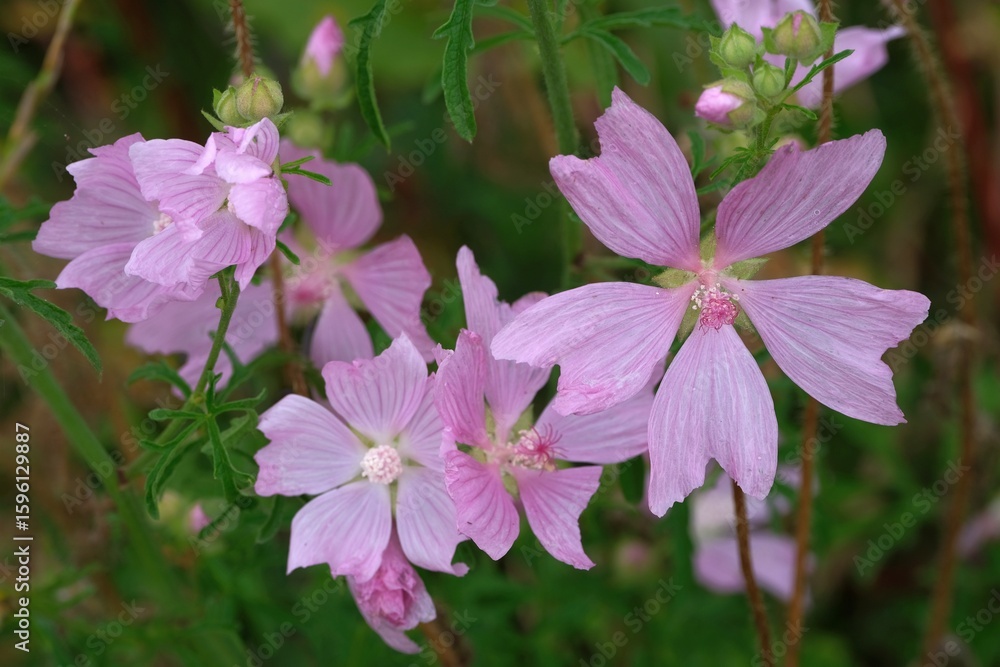 Close-up view of pink flowers of musk-mallow (Malva moschata) growing in a naturalistic garden